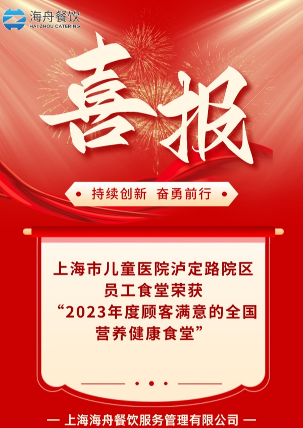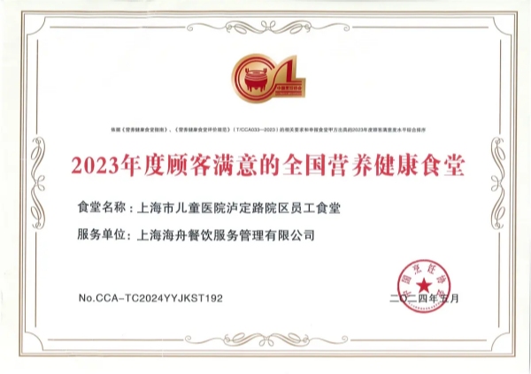 五月,上海海舟餐飲服務管理有限公司旗下兒童醫(yī)院瀘定路院區(qū)員工食堂榮獲“2023年度顧客滿意的全國營養(yǎng)健康食堂”。